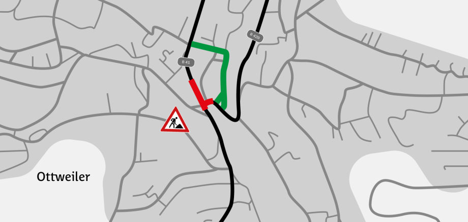 Mit Beginn des zweiten Bauabschnitts gilt an der B 41 eine Einbahnregelung in Fahrtrichtung St. Wendel. In der Gegenrichtung werden entsprechende Umleitungsstrecken eingerichtet: