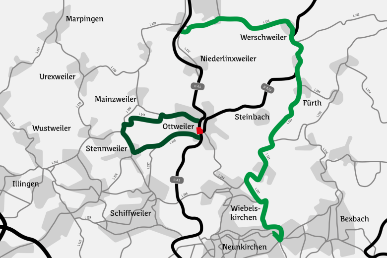 - L 141, L 292 und L 128: In Ottweiler von der B 41 ab der Einmündung „Augasse“ über die „Illinger Straße“, Welschbach und Stennweiler zurück nach Ottweiler